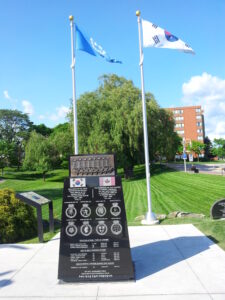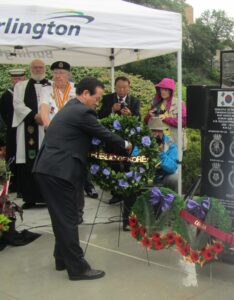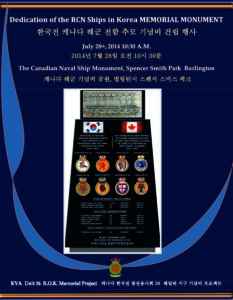 “The RCN 8 Ships that served in Korea Monument” was erected by the KVA Unit 26, Hamilton R.O.K Memorial Committee on July 28, 2014 at the Spencer Smith Park in Burlington to honour and remember the 9 deceased sailors of the 8 ships that served in Korea. As a Fundraising Director of the Monument committee, it was my honour to design the monument prototype and helped to erect the monument working with the dedicated committee members (Andy Barber, Ron Kirk, Korean War Naval Veterans, Major (Ret’d) Don Kennedy, Rev. Bill Thomas, Jerry Trudell) to remember the 9 sailors. They were the forgotten heroes of the Korean War. We will remember them.