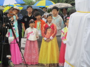 singing Korean National Anthem wearing Korean Traditional Dress (Hanbok).